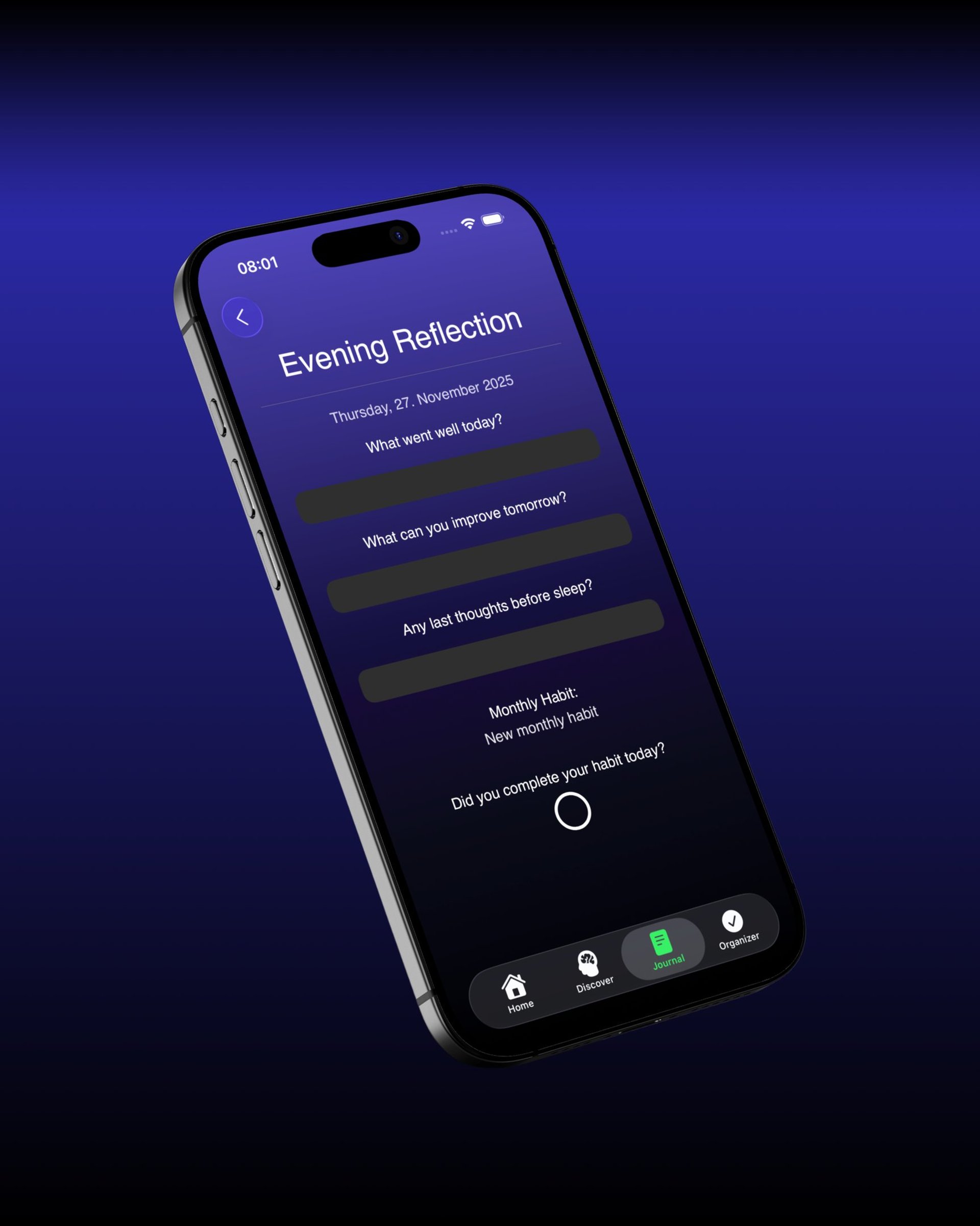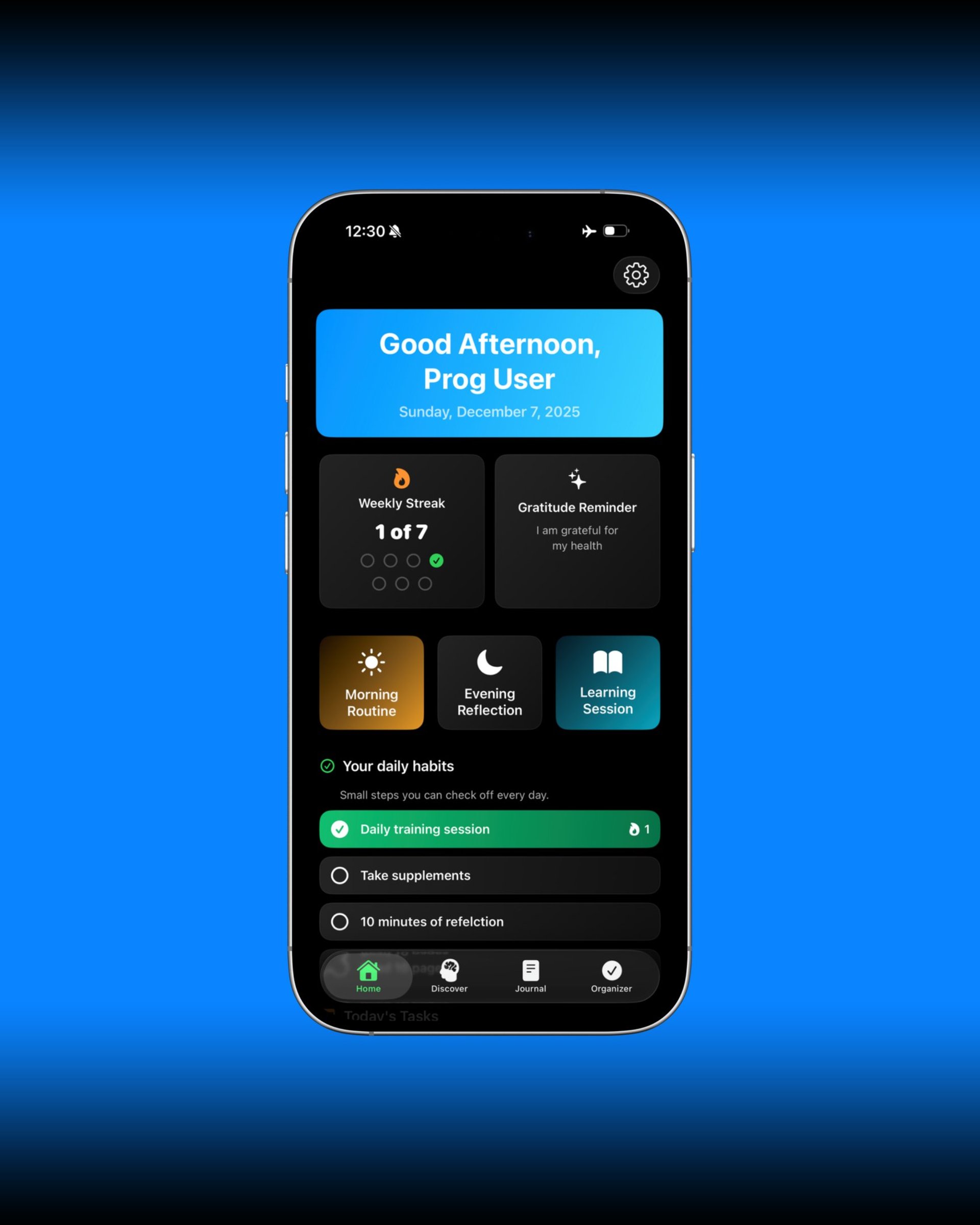 PROG ist die Self-Improvement-App, die dir Struktur gibt, dein tägliches Wachstum unterstützt und dir hilft, produktiver, disziplinierter und erfüllter zu leben.
