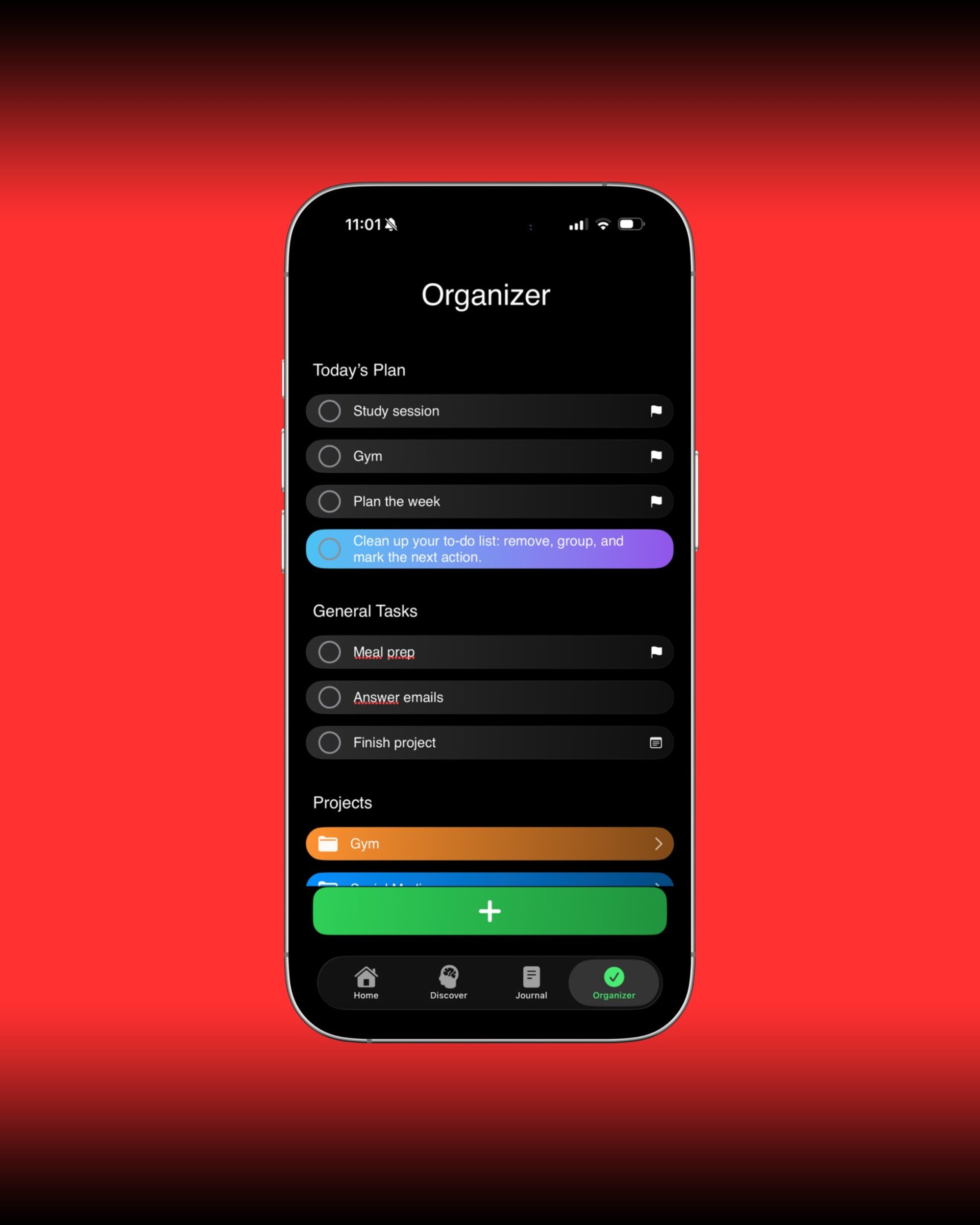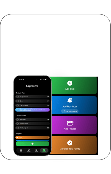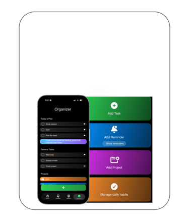Hier siehst du einen ersten Einblick in den Organizer, das Journal, Microlearning, Erinnerungen, Projekte und die Startseite.